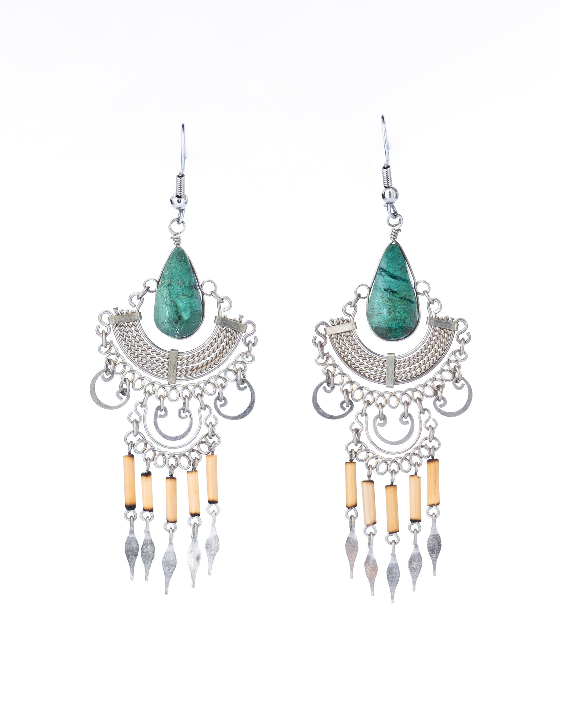 Delicately engraved in silver and adorned with serene Chrysocolla, these elegant earrings celebrate the essence of the sacred feminine. Known as the Goddess Stone, Chrysocolla symbolizes peace, clarity in communication, and emotional harmony. The gentle weight and organic design make these earrings a graceful tribute to inner calm and quiet strength.