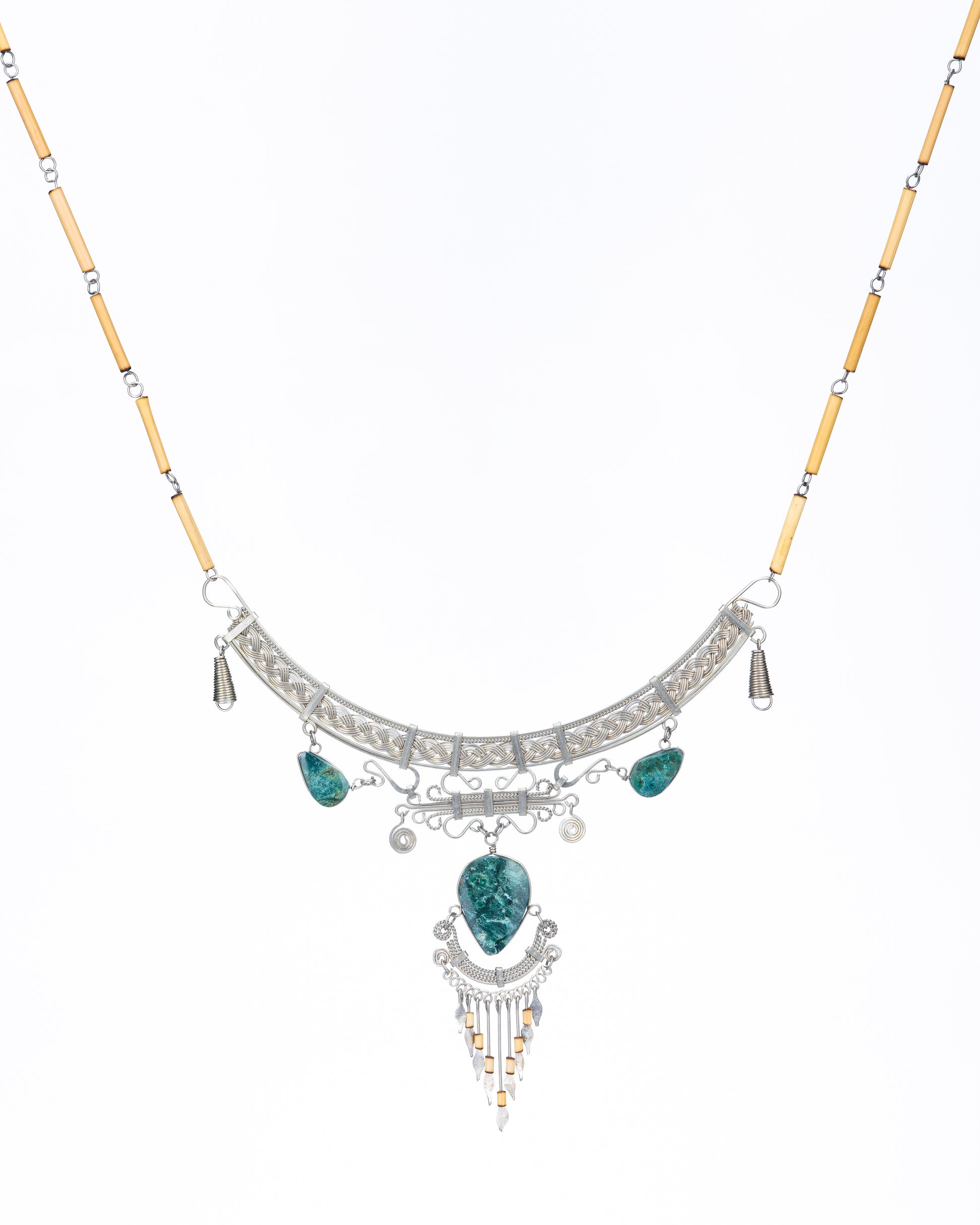 Crafted from intricately engraved silver and strung with warm, organic wood beads, this striking necklace features the tranquil beauty of Chrysocolla — the revered Goddess Stone. Symbolizing peace, communication, and sacred feminine energy, Chrysocolla brings a calming yet powerful presence to the piece. The natural contrast between polished silver and earthy wood adds depth and harmony to the design.