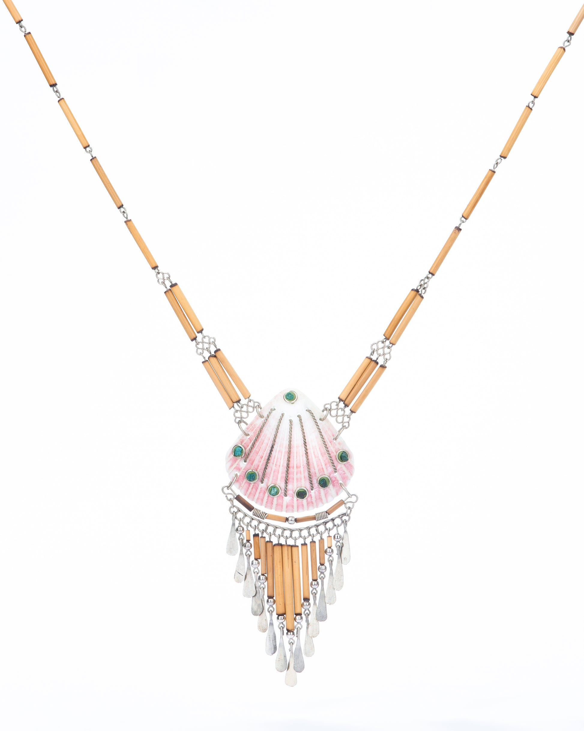 Hand-assembled with natural shell, delicate filigree silverwork, bamboo wood, and Andean-inspired details, this piece blends refined elegance with raw earth energy.