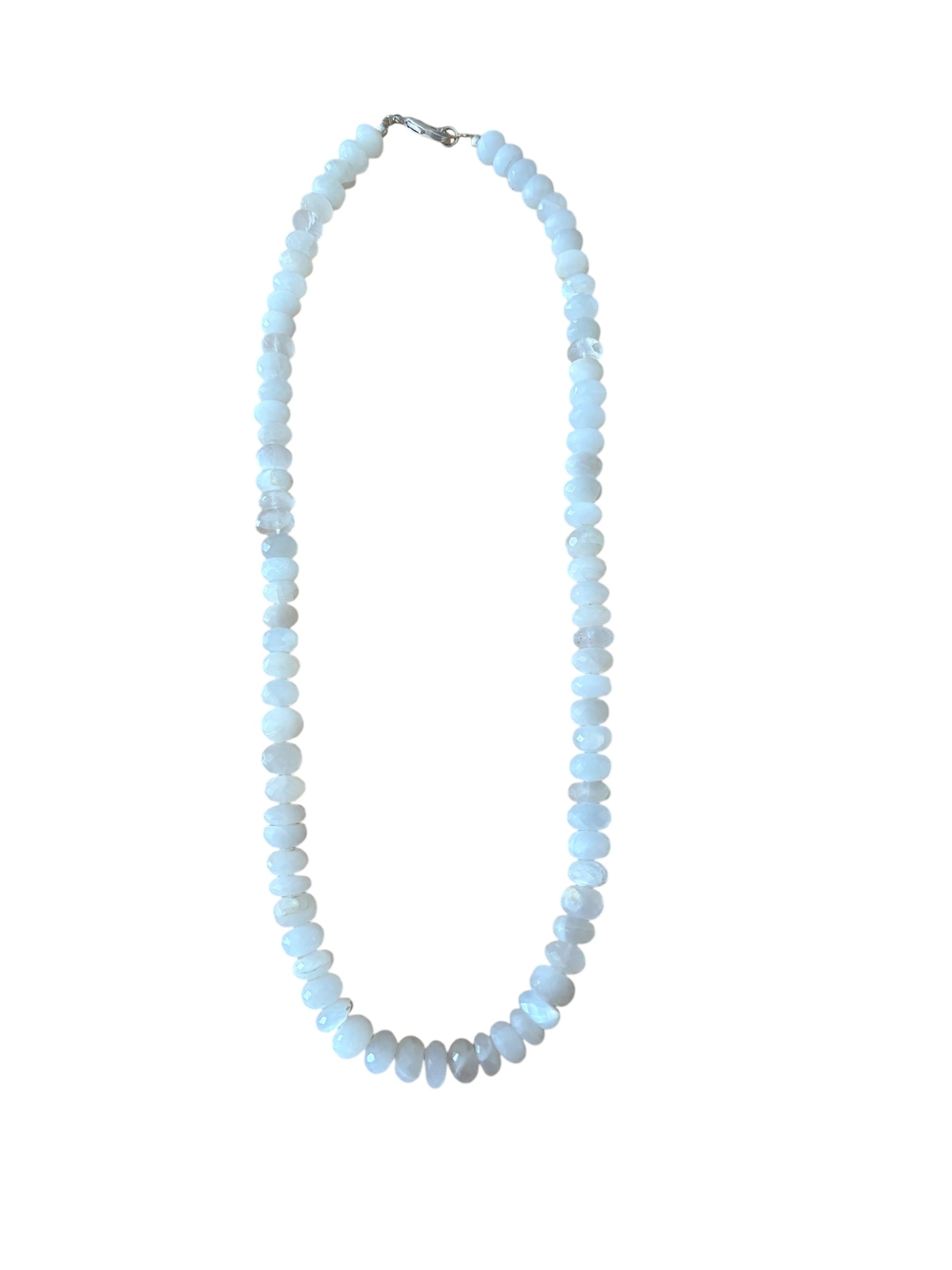Crafted with natural, untreated moonstone beads sourced from Sri Lanka, this necklace captures the quiet magic of the night sky. The smooth rondelle beads — slightly graduated for graceful flow — shimmer with a soft bluish glow, known as adularescence, unique to high-quality moonstone.